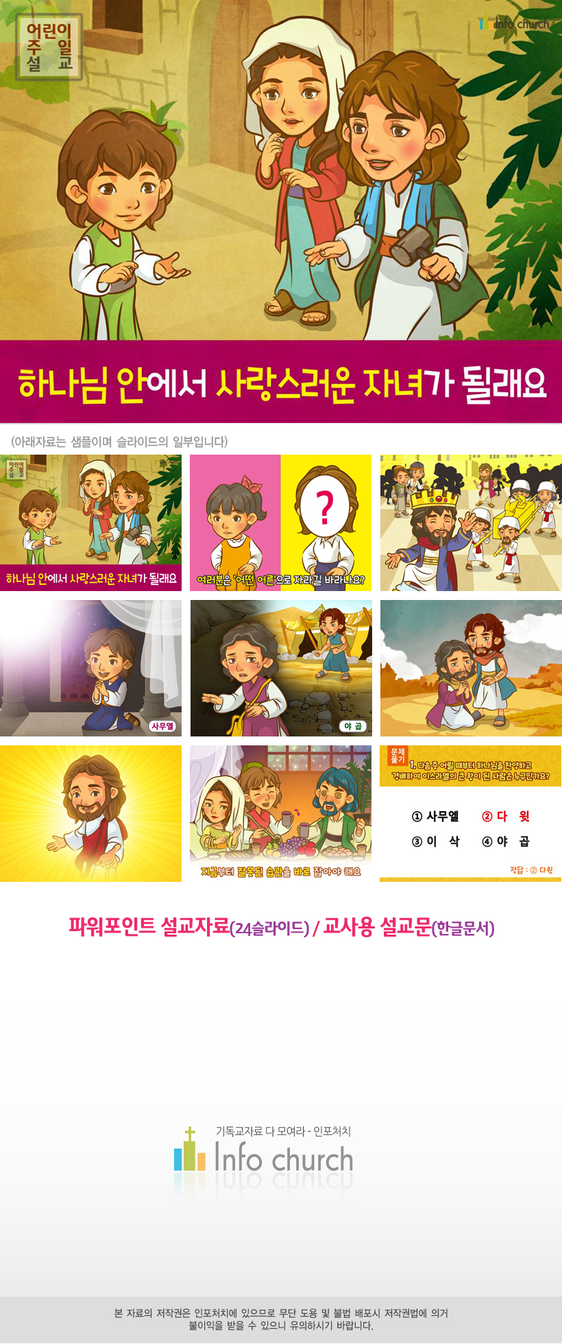 예수님의 어린시절에 대한 ppt 자료가 있을거라 생각되어 구입한건데 전혀 다른 인물들에 대한 내용으로 이끌어가는게 황당하네요. 이럴거면 ppt 샘플을 다 보여주시거나 내용에 대한 설명을 정확히 해주셨어야 하는것은 아닌가요?