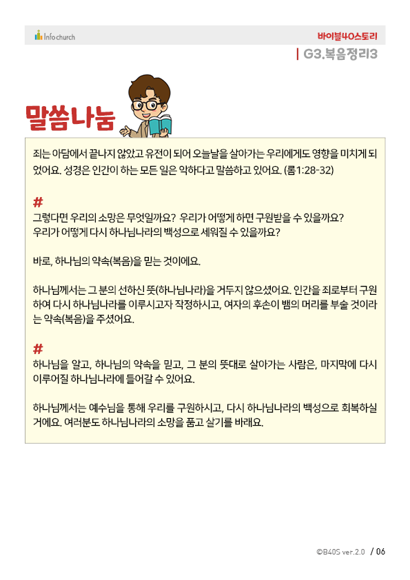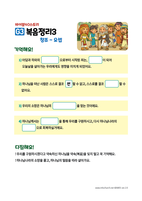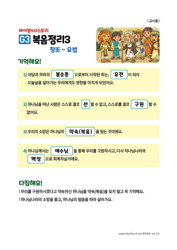 복음정리는, 아이들이 그동안 들었던 이야기를 다시 한번 정리하고 생각과 마음에 새길 수 있는 중요한 시간입니다.
