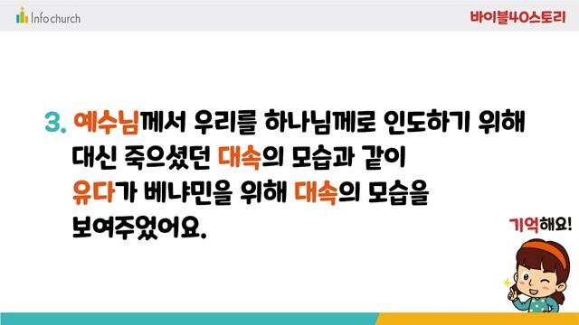 베냐민이 노예가 되어야 하는 상황에서, 유다는 대속의 모습을 보여줍니다. 예수님께서 우리를 하나님께로 인도하기 위해 대신 죽으셨던 대속의 모습과 같이, 유다가 베냐민을 아버지 야곱에게 온전히 보내기 위해 대속의 모습을 보여주었습니다.